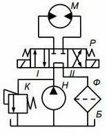 В объемном гидроприводе (рис. 3.1.2) используется гидромотор М с рабочим объемом V0ГМ и КПД объемным ηоб.ГМ.При потерях давления в напорной гидролинии Δрнап, гидрораспеределителе Δррасп и сливной гидролинии Δрсл и утечке рабочей жидкости в гидроаппар