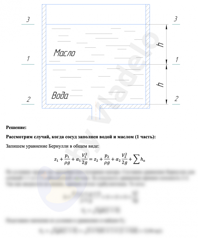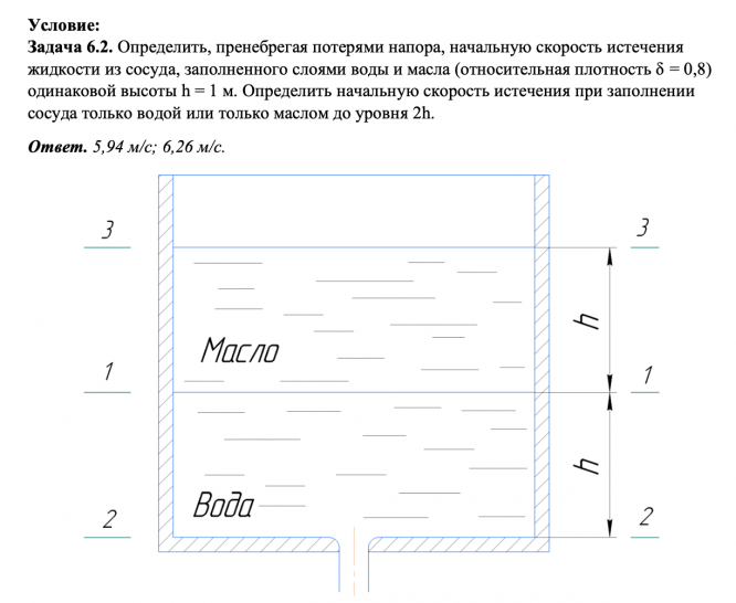 Задача 6.2. Определить, пренебрегая потерями напора, начальную скорость истечения жидкости из сосуда, заполненного слоями воды и масла (относительная плотность δ = 0,8) одинаковой высоты h = 1 м. Определить начальную скорость истечения при заполнении сосуда только водой или только маслом до уровня 2h..