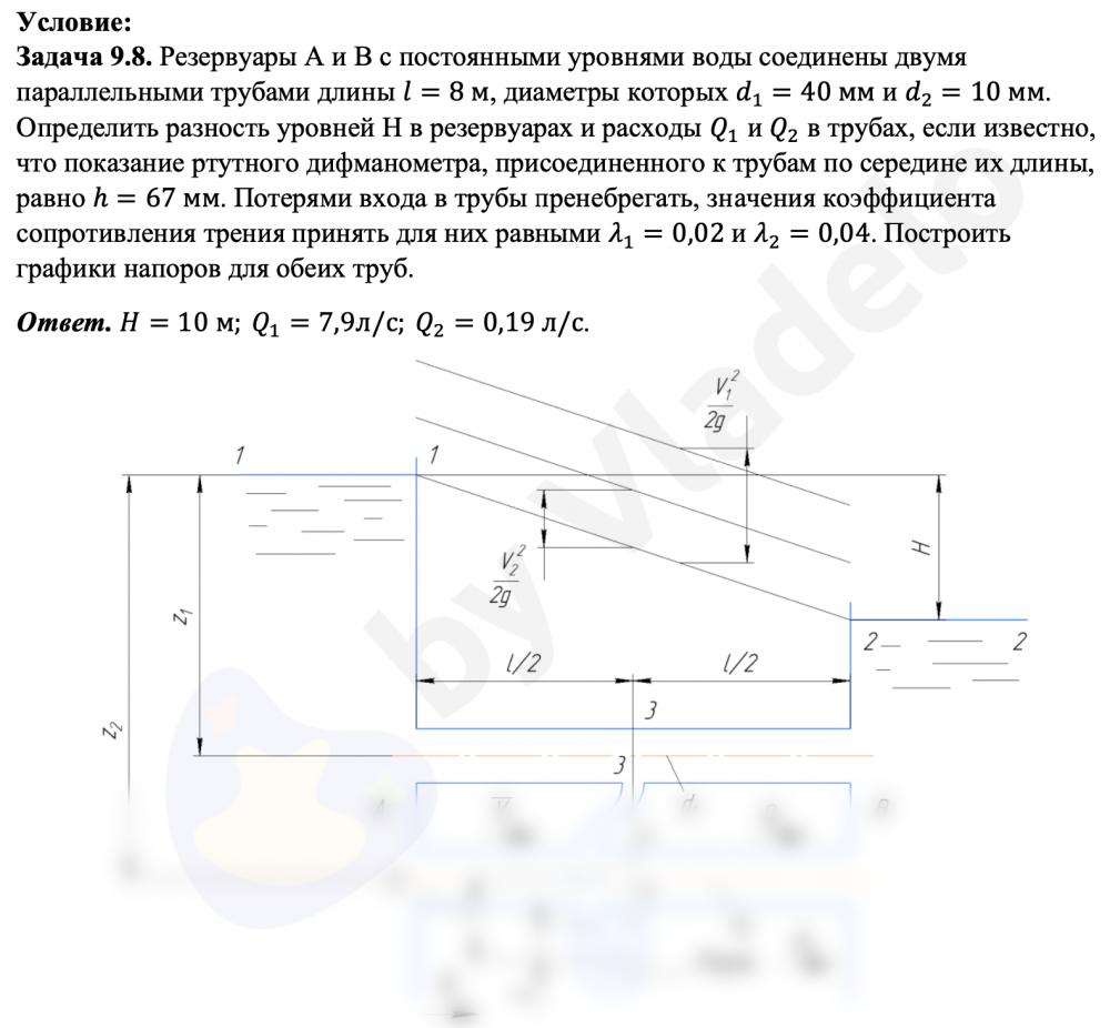 Задача 9.8. Резервуары А и В с постоянными уровнями воды соединены двумя параллельными трубами длины 𝑙 = 8 м, диаметры которых 𝑑1 = 40 мм и 𝑑2 = 10 мм. Определить разность уровней Н в резервуарах и расходы 𝑄1 и 𝑄2 в трубах, если известно, что показание ртутного дифманометра, присоединенного к трубам по середине их длины, равно ℎ = 67 мм. Потерями входа в трубы пренебрегать, значения коэффициента сопротивления трения принять для них равными 𝜆1 = 0,02 и 𝜆2 = 0,04. Построить графики напоров для обеих труб..