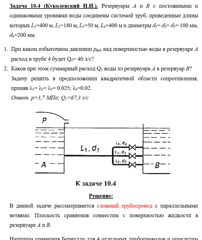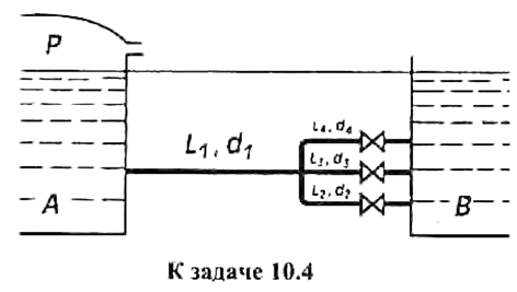 Задача (Куколевский И.И.) 10-4. Резервуары А и В с постоянными и одинаковыми уровнями воды соединены системой труб, приведенные длины которых L1=400 м, L2=180 м, L3=50 м и L4=400 м и диаметры d1= d2= d3= 100 мм, d4=200 мм. При каком избыточном давлении pи
