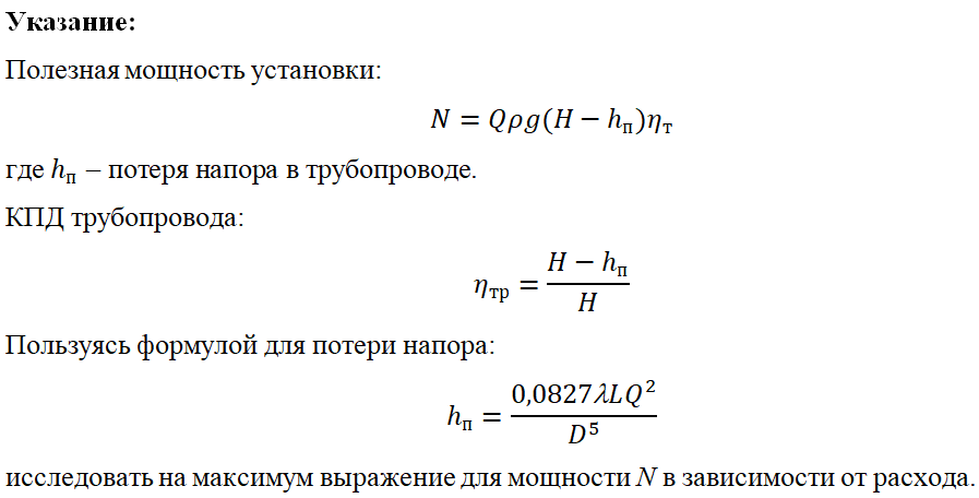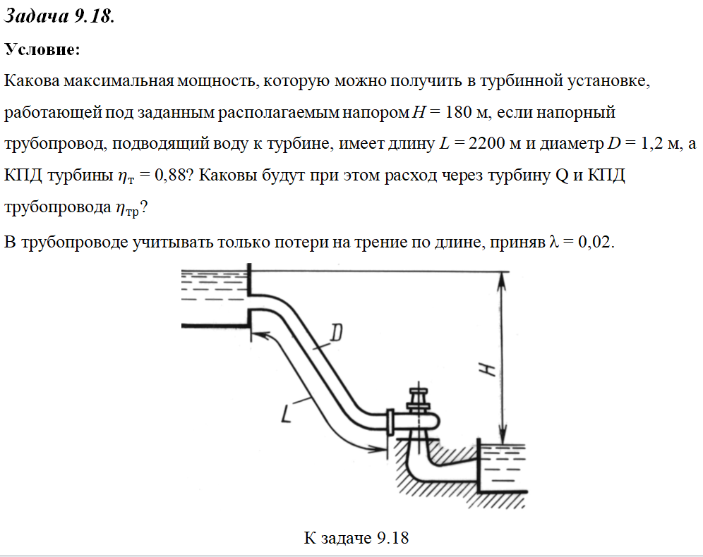 Какова максимальная мощность, которую можно получить в турбинной установке, работающей под заданным располагаемым напором H = 180 м, если напорный трубопровод, подводящий воду к турбине, имеет длину L = 2200 м и диаметр D = 1,2 м, а КПД турбины η_т =