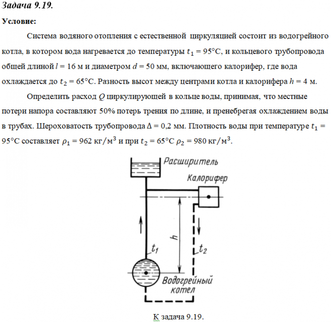 Для студентов по предмету Механика жидкости и газа (МЖГ или Гидравлика)Система водяного отопления с естественной циркуляцией состоит из водогрейного котла, в котором вода нагревается до температуры t_1 = 95C, и кольцевогСистема водяного отопления с естественной циркуляцией состоит из водогрейного котла, в котором вода нагревается до температуры t_1 = 95C, и кольцевог