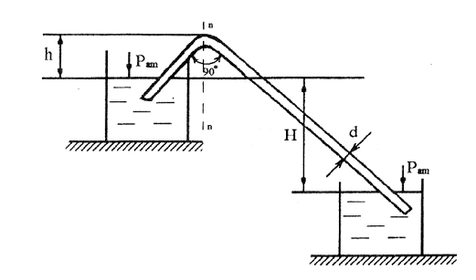 Определить расход воды Q при температуре t = 13 °С и полное давление р в высшей точке нового стального сифонного трубопровода (рис. 1), если его диаметр d = 50 мм, длина L = 9 м, разность уровней воды в резервуарах Н = 1,1 м; превышение наивысшей точки сифона над уровнем воды в первом резервуаре h = 0,9 м, а расстояние от начала трубопровода до сечения n-n равно 3 м.