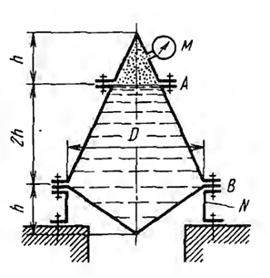Определить усилия, нагружающие болтовые группы А и В сборного конического резервуара, содержащего воду, если h = 1м, наибольший внутренний диаметр сосуда D = 3м, а показание манометра М = 40 кПа.