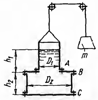 Составной цилиндрический сосуд, заполненный водой до высоты h1+h2 = 800 мм, подвешен на шнуре, перекинутом через блоки, и соединен с грузом массой m = 200 кг. Определить нагрузки болтовых групп А, В и С при имеющем место ускоренном движении сосуда. Размеры сосуда D1 = 400 мм, D2=600 мм, h1 = 300 мм. Собственным весом сосуда и трением в блоках пренебречь.
