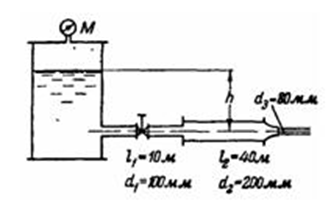 Задача (Куколевский И.И.) 9-11. Для горизонтального трубопровода, размеры которого указаны на схеме, определить расход Q при заданном давлении М = 4 атм и уровне воды в резервуаре Н = 5 м. Коэффициенты сопротивления вентиля С = 4 и сопла ξ = 0,06 (сжатие струи на выходе из сопла отсутствует). Шероховатость каждого из участков трубопровода 1 мм (старые водопроводные трубы). Как изменится Q, если диаметр первого участка увеличить до d1 = 200 мм? Построить графики напоров по длине трубопровода.