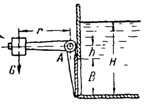 Квадратное отверстие размером В*В = 1*1 м3 в вертикальной стенке резервуара закрыто плоским щитом, который прижимается к стенке грузом О на плече r= 1,5 м. 1) Найти минимальную величину груза G, достаточную для удержания воды в резервуаре на уровне H=2 м, если расстояние от верхней кромки отверстия до оси вращения щита h = 0,3 м. Определить при этом реакцию R цапф А щита. 2) Определить, какой наименьший вакуум ри над водой в резервуаре будет удерживать щит без груза?