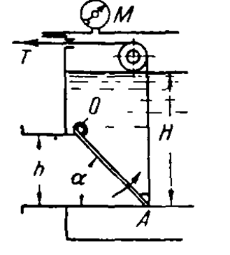 Поворотный клапан АО закрывает выход из бензохранилища в трубу квадратного сечения со стороной h = 0,3 м. Прямоугольная пластина клапана опирается на срез трубы, сделанный под углом а = 45. Определить (без учета трения) силу Т натяжения троса, необходимую для открытия клапана, если уровень бензина H = 0,85 м, а давление паров бензина равно по манометру М = 0,05 кГ/см2. Удельный вес бензина у = 700 кГ/м.