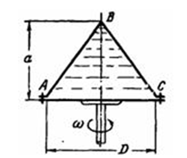 Определить силу давления на коническую боковую поверхность АВС и плоское дно АС сосуда, целиком заполненного водой и вращающегося с угловой скоростью wо = 20 рад/с, если известно, что в верхней точке В сосуда вакуум равен рв = 20 кПа. Размеры сосуда: D=1 м; а = 1 м.
