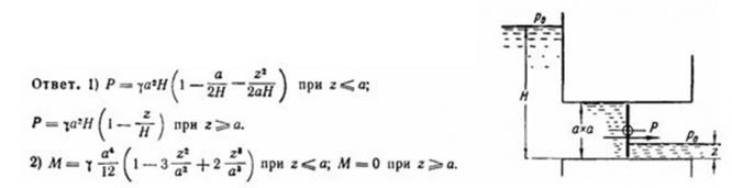Слева от квадратного дискового затвора размером а*a уровень воды постоянен (H), а справа переменен (z). Выразить в зависимости от z суммарную гидравлическую силу Р, действующую на затвор, и ее момент M относительно оси вращения затвора, проходящей через его центр тяжести. Указать наибольшие значения Р и М в интервале 0<z<H.