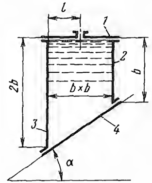 По наклоненной под углом а = 45° к горизонту плоскости под действием силы тяжести скользит призматический сосуд, целиком заполненный водой. Сосуд закрыт крышкой с малым отверстием, расположенным на расстоянии l = 0,5 м от передней стенки. Собственный вес сосуда G=150 кГ, размер b=1 м, коэффициент трения дна сосуда о плоскость скольжения f= 0,278. Найти величины сил давления воды на крышку 1, стенки 2 и 3, дно 4, считая, что жидкость из сосуда не выливается.