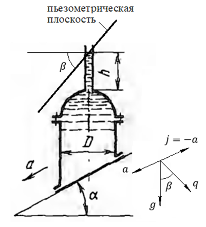 Вычислить величины горизонтальной и вертикальной сил давления на полусфгрическую крышку цилиндрического сосуда диаметром D = 0,6 м, скользящего с ускорением а = 5 м/с2 по плоскости, наклоненной под углом а = 60° к горизонту, если сосуд заполнен водой до уровня h=1 м в открытой трубке, присоединенной к верхней точке сосуда. Как изменятся эти силы, если сосуд остановить?
