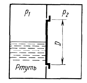 Отверстие в перегородке замкнутого сосуда закрыто круглой крышкой диаметром D = 0,5 м. Левая секция залита ртутью до центра отверстия; над ртутью находится газ под абсолютным давлением р1 = 0,1 ата. В правой секции находится газ под абсолютным давлением р2. Определить: 1) Силу давления Р на крышку при абсолютном вакууме в правой секции 2) При каком давлении р2 сила P будет равна нулю? Найти в этом случае момент М пары сил, действующей на крышку.