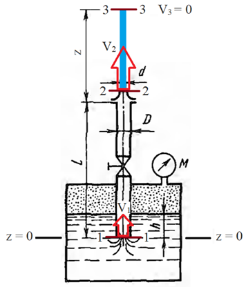Из бака с постоянным уровнем при показании манометра М = 175 кПа вода вытекает в атмосферу через сходящийся насадок диаметром d = 25 мм, присоединенный к вертикальной трубе диаметром D = 50 мм и длиной L = 3 м. Труба опущена под уровень на h = 0,5 м и снабжена прямоточным вентилем.