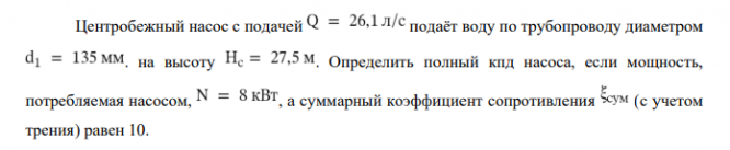 Задача: Центробежный насос с подачей подаёт воду по трубопроводу диаметром
