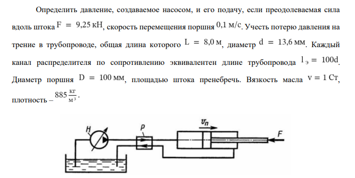 Определить давление, создаваемое насосом, и его подачу, если преодолеваемая сила вдоль штока , скорость перемещения поршня . Учесть потерю давления на трение в трубопроводе, общая длина которого , диаметр . Каждый канал распределителя по сопротивлению эквивалентен длине трубопровода . Диаметр поршня , площадью штока пренебречь. Вязкость масла , плотность