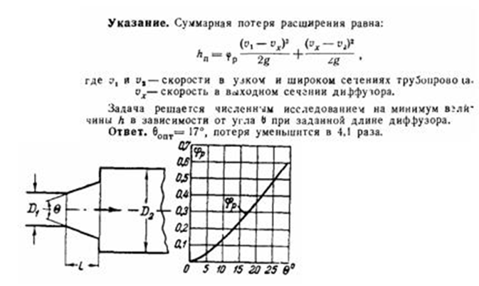 1) Оптимальный угол раскрытия диффузора, при котором суммарные потери расширения потока в трубопроводе будут наименьшими, пользуясь для определения потери расширения в диффузоре графиком зависимости коэффициента этой потери от угла.