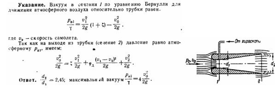 Трубка Вентури, установленная на самолете, должна отсасывать воздух из камеры гироскопа, приводя последний во вращение. Определить соотношение выходного диаметра d2 и диаметра горловины трубки d1, при котором вакуум в горловине будет максимальным. Коэффициент сопротивления сходящегося входного участка трубки ξ = 0,04, коэффициент потерь в диффузоре φД = 0,2. Сжимаемостью воздуха пренебречь.