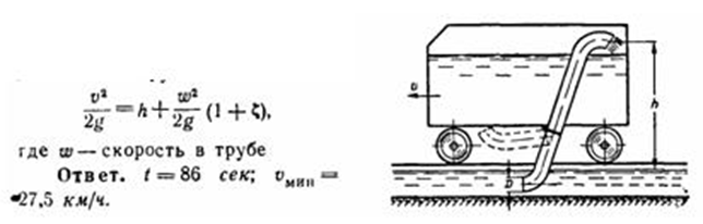 Для заполнения водой паровозного тендера на ходу поезда, в специально устроенный между рельсами лоток с водой опускается труба приемного устройства диаметром D=200 мм., так что входное сечение трубы располагается навстречу потоку. Суммарный коэффициент потерь в приемном устройстве, отнесенный к средней скорости в трубе, равен С = 2, а высота подъема воды h = 3 м. Определить: 1) Время, необходимое для заполнения тендера емкостью W=10 м3 при скорости поезда у = 36 км/ч. 2) При какой наименьшей скорости поезда это приемное устройство перестанет работать? Указание. Из уравнения Бернулли для относительного движения в трубе имеем: