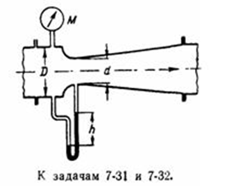 Определить объемный и весовой расходы воздуха, протекающего через трубу Вентури с размерами D = 50 мм и d = 25 мм, если показание манометра перед расходомером M = 15 атм, температура воздуха t = 20°С, показание дифференциального водяного манометра Н =150 мм и коэффициент расхода μ = 1. Удельная газовая постоянная воздуха R=287 Дж/(кг*К). Атмосферное давление принять равным 0,1 МПа. См. указание к задаче 7.29.