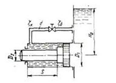 Гидравлическое реле времени (служит для включения и выключения различных устройств через фиксированные интервалы времени) состоит из цилиндра, в котором помещен поршень диаметром D1 = 80 мм со штоком - толкателем диаметром D2 = 40 мм. Цилиндр присоединен к емкости с постоянным уровнем жидкости H0=0,9 м. Под действием давления, передающегося из емкости в правую полость цилиндра, поршень перемещается, вытесняя жидкость из левой полости в ту же емкость через трубку диаметром d= 10мм. Вычислить время Т срабатывания реле, определяемое перемещением поршня на расстояние S = 100 мм из начального положения до упора в торец цилиндра. Движение поршня считать равномерным на всем пути, пренебрегая незначительным временем его разгона. В трубке учитывать только местные потери напора, считая режим движения жидкости турбулентным. Коэффициент сопротивления колена ?к = 1,5 и дросселя на трубке ?д = 22. Утечками и трением в цилиндре, а также скоростными напорами жидкости в его полостях пренебрегать.