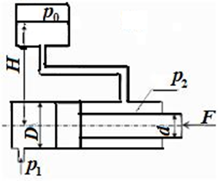 Определить давление р1 жидкости, которую необходимо подвести к гидроцилиндру, чтобы преодолеть усилие, направленное вдоль штока F. Диаметры: цилиндра D, штока d. Давление в бачке р0 (избыточное), высота Н. Силу трения не учитывать. Плотность жидкости ρ.