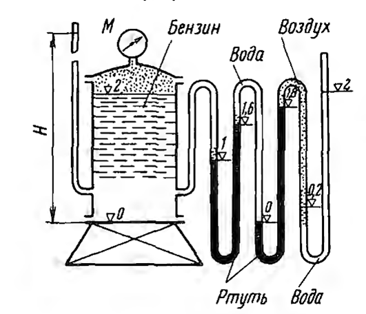 К резервуару, наполненному бензином (δ = 0,7) до высоты 2, присоединены три различных прибора для измерения давления. К крышке резервуара присоединен пружинный манометр, к боковым стенкам пьезометр и трехколенный манометр, наполненный ртутью (δ = 13,6), водой (δ = 1) и воздухом (δ = 0). Определить показания М манометра и Н пьезометра, если уровни жидкостей в трехколенном манометре расположились так, как показано на эскизе /отметки уровней даны в метрах).