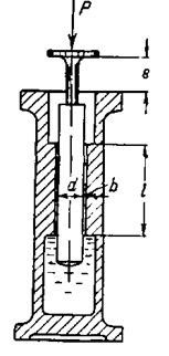 Плунжер пресса, опускаясь под действием постоянной силы P = 40 Н, выдавливает масло через зазор, равный b = 0,1 мм из цилиндра в атмосферу. Считая, что плунжер, и цилиндр расположены соосно, определить время посадки плунжера при его начальном расстоянии от седла, равном s = 0,1 м. Длина щели l = 70 мм; диаметр плунжера d = 20 мм; динамическая вязкость масла 0,8 П