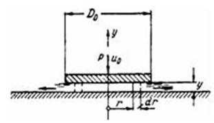 Круговая пластинка диаметром D, находясь под действием силы Р, медленно опускается и выдавливает слой жидкости, вязкость которой равна м. Приняв течение жидкости ламинарным, определить закон нарастания усилия на пластинке при движении пластинки с постоянной скоростью и„ по направлению к неподвижной плоскости. Определить затем закон движения пластинки (путь-время), если сила Р постоянна. В течение каждого бесконечно малого промежутка времени рассматривать движение жидкости как установившееся.