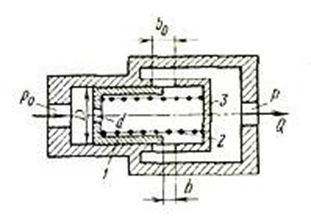 Ограничитель расхода, который служит для автоматического поддержания постоянного расхода в системе при постоянном входном давлении P, и переменном противодавлении р, состоит из подвижного поршня 1 диаметром D = 60 мм. имеющего отверстие d=10 мм и нагруженного пружиной 2. При изменении противодавления р поршень перемещается, изменяя открытие b окон в корпусе 3 таким образом, что расход через ограничитель остается постоянным. Высота прямоугольных окон в корпусе b0, = 5 мм их суммарная площадь f = 1,5 см2. Считая усилие пружины постоянным и равным R = 550 Н, определить при давлении масла на входе P0 = 15 МПа: 1) расход Q, поддерживаемый ограничителем; 2) зависимость открытия b окон от противодавления р и открытие при P= 0; 3) максимальное значение противодавления Pmах, начиная с которого расход через ограничитель будет уменьшаться. Коэффициент расхода отверстия в поршне и окон в корпусе принять м= 0,6. Плотность масла р = 850 кг/м3,