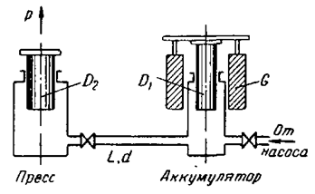Вода подается в цилиндр пресса гидравлическим грузовым аккумулятором по стальному трубопроводу длиной l=180 м и диаметром d = 50 мм. Вес подвижных частей аккумулятора G= 40 т, диаметр его плунжера D1 =220 мм ч к. п. д. рабочего хода 0,95. Определить усилие Р, развиваемое прессом при скоростях его плунжера v = 0,1 и 0,2 м/сек. Диаметр плунжера D2 = 300 мм, к. п. д. цилиндра пресса 0,95 (весом плунжера пренебрегать). Шероховатость стенок трубопровода 0,2 мм, местные потери составляют 10% потерь на трение. Вязкость воды v= 1,25 cст.