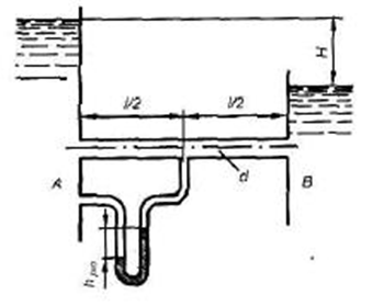Определить расход Q масла, перетекающего по трубе из бака А в бак В, к располагаемый напор H, если показание ртутного дифманометра, присоединенного одной ветвью в баку А и другой ветвью - к сечению на середине длины трубы, hрт = 440 мм. Длина трубы l = 10 м, ее диаметр d = 20 мм и шероховатость 0,01 мм. Плотность масла р = 850 кг/м3, его кинематическая вязкость v = 4 сСт.