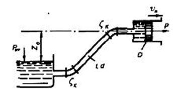 Поршень диаметром D = 60 мм, двигаясь равномерно, всасывает керосин (р= 850 кг/м3, v = 2 сСт) из открытого бака при атмосферном давлении Pат = 100 кПа. Высота всасывания z0 = 3 м. Всасывающая труба {шероховатость Δ = 0,05 мм) имеет размеры l = 8 м, d = 20 мм. Коэффициент сопротивления каждого из колен на трубе ξ = 0,4. Определить максимально возможную скорость vп поршня по условию кавитации в цилиндре, если известно, что давление насыщенных паров керосина Рнп =16,6кПа. Какова при этом внешняя сила Р, которая должна быть приложена к поршню? Трением поршня в цилиндре пренебречь. Построить график напоров.