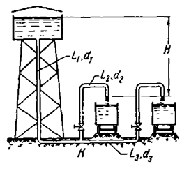 Паровозный тендер емкостью 20 м3 должен наполняться водой (v = 0,01 см2/сек) в течение 10 мин из путевого крана К, соединенного с водонапорной башней трубопроводом длиной L1=800 м. Определить: 1) Диаметр d1 этого трубопровода, если напор в башне Н = 20 м и кран соединен с тендером трубой длиной l2 =20 м и диаметром d2 = d1. 2) Как повлияет на время заполнения тендера присоединение второго крана с трубой L3 = 80 м d3 = d? Трубопроводы стальные с шероховатостью Местными потерями пренебречь.