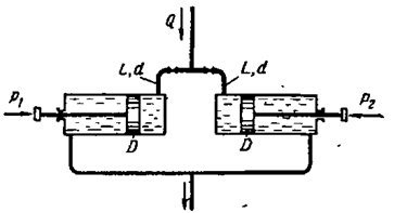 Перемещение поршней гидроцилиндров диаметра D= 15 см, нагруженных внешними силами R1 = 1000 Н и R2 = 2000 Н, осуществляется подачей спиртоглицериновой смеси (v = 1 Ст, р = 1245 кг/м3) по трубам одинаковой приведенной длины L=10 м и диаметра d=4 см в гидроцилиндры 1 и 2. Определить: 1) Скорости перемещения поршней при расходе Q = 7 л/сек в магистрали. 2) Какое дополнительное сопротивление (выражаемое эквивалентной длинной) и в какой трубе нужно создать, чтобы при том же расходе в магистрали скорости поршней стали одинаковыми? Сопротивлением сливной линии пренебречь, считая давление в нерабочих полостях атмосферным.