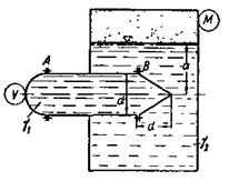 Горизонтальный цилиндрический сосуд диаметром d = 0,8м с полусферической и конической тонкостенными крышками заполнен жидкостью удельного веса р1. Правая половина цилиндра (с конической крышкой) вставлена в замкнутый резервуар и находится под уровнем другой жидкости (удельного веса уа) на глубине а = 2м. Определить горизонтальные и вертикальные составляющие сил давления жидкости на полусферическую и коническую крышки А и В, если показание вакуумметра V = 10 кПа, показание манометра М=30 кПа и р1=р2=1000 кг/м3. Показать на чертеже горизонтальные и вертикальные составляющие и полные силы давления жидкости на полусферу и конус. Как изменятся силы при р1= 0,8 р2= 800 кк/м3?