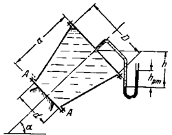 Определить растягивающие и срезающие усилия, нагружающие болты фланца А конического резервуара размерами D=1 м; d = 0,5м и а=1 м, заполненного жидкостью удельного веса р = 750 кг/м3. Давление в резервуаре измеряется ртутным манометром, показание которого hрт = 300 мм высота h=0,5 м Угол наклона оси резервуара к горизонту а = 45° массу резервуара не учитывать.