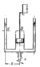 Жидкостный тахометр состоит из цилиндра, наполненного ртутью и сообщенного с двумя трубками малого диаметра d, расположенными на расстоянии R от оси. Цилиндр снабжен поршнем, имеющим диаметр D. Поршень перемещается при изменении числа оборотов тахометра. Установить связь между числом оборотов n тахометра и опусканием h поршня от его начального положения при невращающемся тахометре.