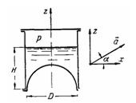 Закрытый цилиндрический сосуд диаметром D = 0,6 м, имеющий полусферическое дно, наполнен до уровня H = 0,8 м водой и движется прямолинейно под углом а = 30° к горизонту с постоянным ускорением а = 2g. Определить вертикальную и горизонтальную силы давления на дно, если избыточное давление газа лад поверхностью воды в сосуде Рн = 20 кПа.