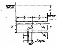 Резервуары А и В с постоянными уровнями воды соединены двумя параллельными трубами одинаковой длины l = 8 м, диаметры которых d1 = 40 мм и d2 = 10 мм. Определить разность уровней Н в резервуарах и расходы Q1 и Q2 в трубах, если известно, что показание ртутного дифманометра, присоединенного к трубам по середине их длины, равно h=67 мм. Потерями входа в трубы пренебрегать, значения коэффициента сопротивления трения принять для них равными λ1 = 0,02 и λ2 = 0,04. Построить графики напоров для обеих труб.