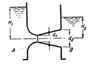 Вода перетекает из сосуда А в сосуд В через плавно сходящийся насадок с диаметром выходного сечения d1 = 100 мм и коэффициентом сопротивления ξ = 0,08 и приставленный к нему с небольшим зазором расходящийся конический насадок с выходным диаметром d2=150 мм и коэффициентом потерь φД = 0,3. При заданном уровне H1= 2,5 м определить уровень H2, при котором протекающая по насадкам вода не будет выливаться через зазор, а атмосферный воздух не будет засасываться внутрь насадков. Построить график напоров.