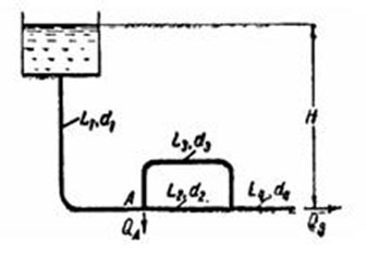 Определить высоту Н уровня воды в резервуаре, при которой для изображенного на схеме трубопровода в случае отбора из узловой точки А расхода QА = 35 л/с в концевом сечении (где давление равно атмосферному) расход будет QB = 50 л/с. Длины, диаметры и коэффициенты трения для ветвей трубопровода следующие;