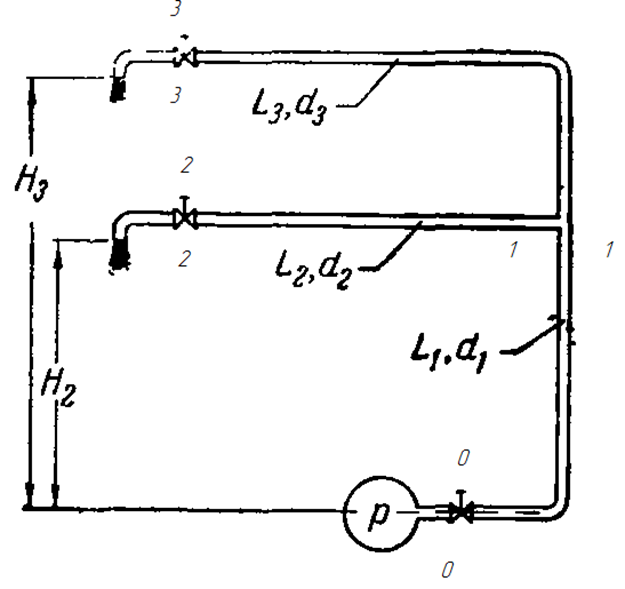 Найти, как распределится расход Q1 = 10 л/сек воды (v = 0,01 Ст) между двумя стальными трубами (? = 0,2 мм), длины которых L2 = 31,2 м, L3 = 71,2 м и диаметры d2 = d3 = 0,05 м, если высоты расположения их выходных сечений H2 = 4 м и Н3 = 10 м а суммарный коэффициент местных сопротивлений каждой трубы ? = 5.