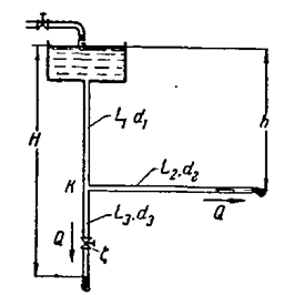 По двум одинаковым, открытым в атмосферу стальным (e= 0,2 мм) трубам длинами L2=L3 = 25 м и диаметрами d2 = d3=50 мм требуется подавать одинаковые расходы Q = 5 л/сек воды (v = 0,01 см2/сек) при напорах H=10 м, h = 7 м. Определить: 1) Необходимый для этого диаметр d4 стальной трубы, длина которой L1 = 50 м, а также необходимую величину С коэффициента сопротивления вентиля, установленного на трубе L3. 2) Какой расход Q' пойдет по трубопроводу и какое давление будет в точке К, если полностью закрыть вентиль на трубе L3.