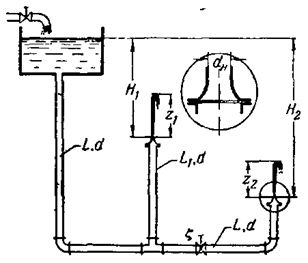 Принять коэффициент сопротивления трения труб равным λ = 0,025. При решении первого вопроса местные потери учитывать только в насадках.