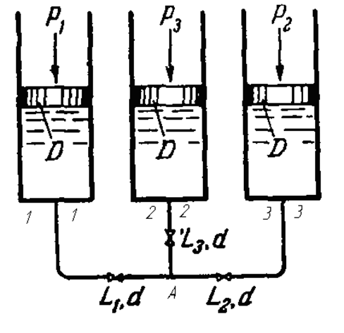 Пренебречь высотами расположения поршней относительно узловой точки системы, трением в цилиндрах и местными потерями напора в трубах.