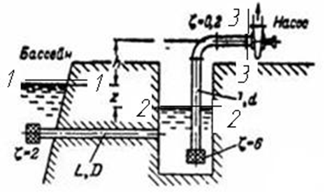 Центробежный насос осуществляет водозабор из бассейна по самотечной трубе через промежуточный колодец. Размеры самотечной трубы L = 20м, D = 150 мм и всасывающей линии насоса l = 12м, d = 150мм, Определить наибольшую производительность насоса, допускаемую по условиям всасывания, если вакуум при входе в насос не должен превосходить 6 м. Коэффициент сопротивления трения в трубах принять λ = 0,03 (значения коэффициентов местных потерь указаны на схеме). Насос расположен выше уровня в бассейне на h = 2 м. Какова будет при этой производительности разность уровней z в бассейне и колодце?