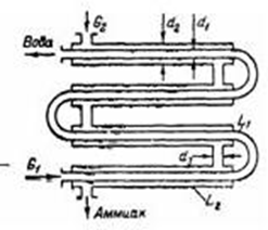 Противоточный переохладитель для аммиака выполнен в виде четырех последовательных секций. каждая из которых образована двумя концентрическими трубами. По внутренней трубе (диаметр которой d1=30 мм и толщина стенки 2,5 мм) течет вода, по межтрубному пространству жидкий аммиак (диаметр внешней трубы d2 = 50мм). Общая дли на внутренней трубы L1 = 22 м, длина каждой секции L2 = 4 м, диаметр соединительных патрубков между секциями d3 = 35 мм.