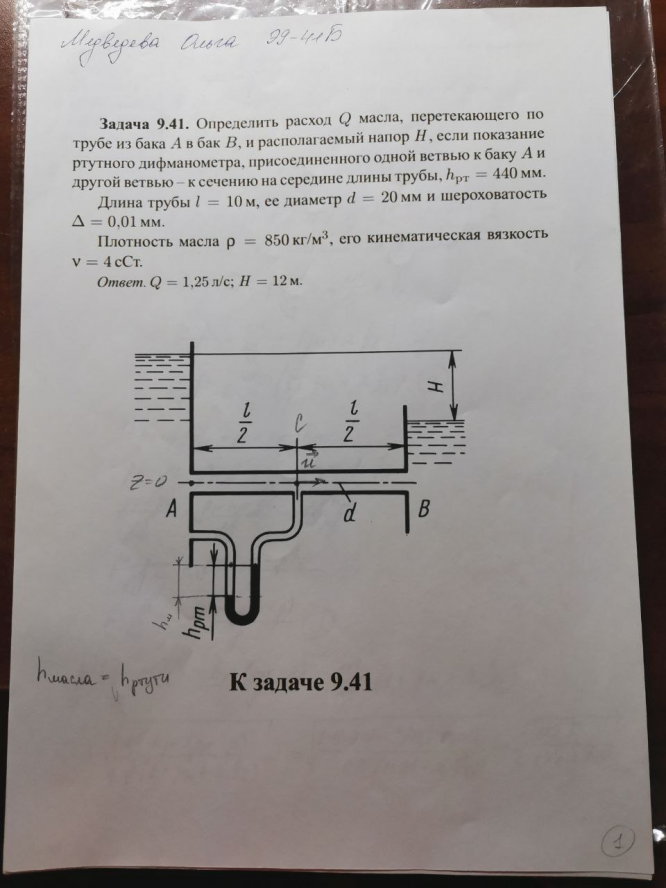 Для студентов по предмету Механика жидкости и газа (МЖГ или Гидравлика)Задача 9-41Задача 9-41