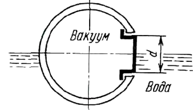 Аппарат, плавающий на поверхности воды (р = 1020 кг/м3), имеет люк, закрытый изнутри плоской крышкой диаметром d = 0,8 м. Определить силу давления Р на крышку, если внутри аппарата вакуум р = 2 кПа. Найти расстояние dl линии действия этой силы до оси люка.